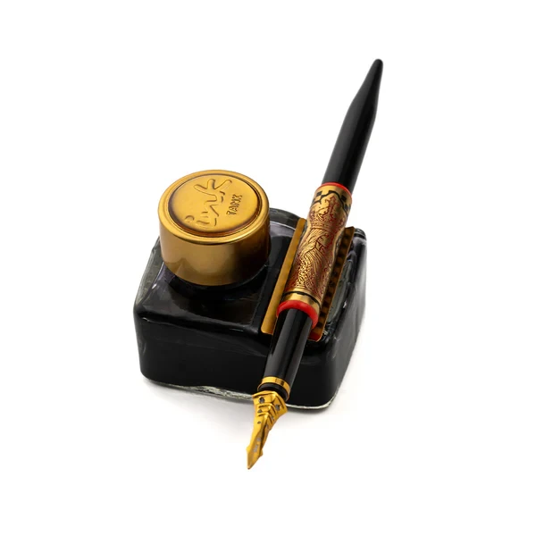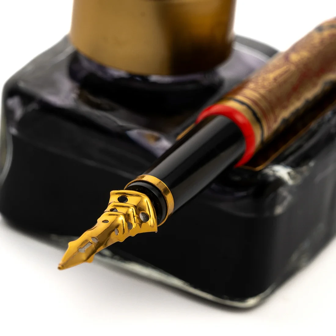 The pen body is glossy epoxy resin while the barrel is brass electro plated with a satin rose gold finish. Ideal to create a look for your desk, these holder dip pens offer smooth writing and holds enough ink to write an entire sentence. An ornate ink tank accompanies these pens, which also acts as a stand. The base has a clear acrylic top with a chess board motif and a black bottom and completes this set of chess inspired pens.