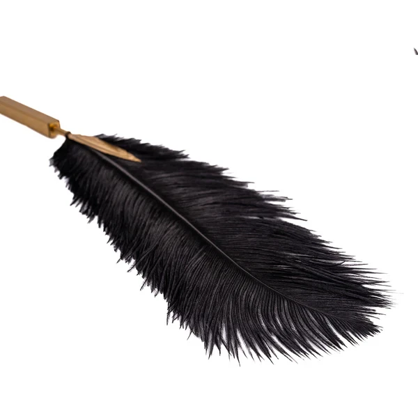 A testament of refinement, here is a pen that oozes class. Intricate floral engraved on the round brass barrel plated in 24K gold. A brass coat of arms brooch also plated in 24K gold forms the upper portion of the pen barrel. The ornate white and black striped pheasant feather completes this stunning pen.