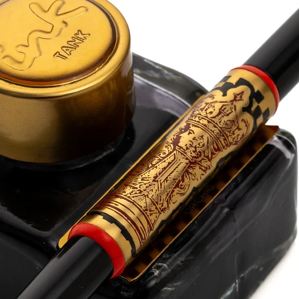 The pen body is glossy epoxy resin while the barrel is brass electro plated with a satin rose gold finish. Ideal to create a look for your desk, these holder dip pens offer smooth writing and holds enough ink to write an entire sentence. An ornate ink tank accompanies these pens, which also acts as a stand. The base has a clear acrylic top with a chess board motif and a black bottom and completes this set of chess inspired pens.