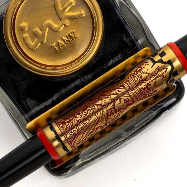 The pen body is glossy epoxy resin while the barrel is brass electro plated with a satin rose gold finish. Ideal to create a look for your desk, these holder dip pens offer smooth writing and holds enough ink to write an entire sentence. An ornate ink tank accompanies these pens, which also acts as a stand. The base has a clear acrylic top with a chess board motif and a black bottom and completes this set of chess inspired pens.