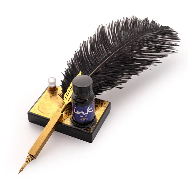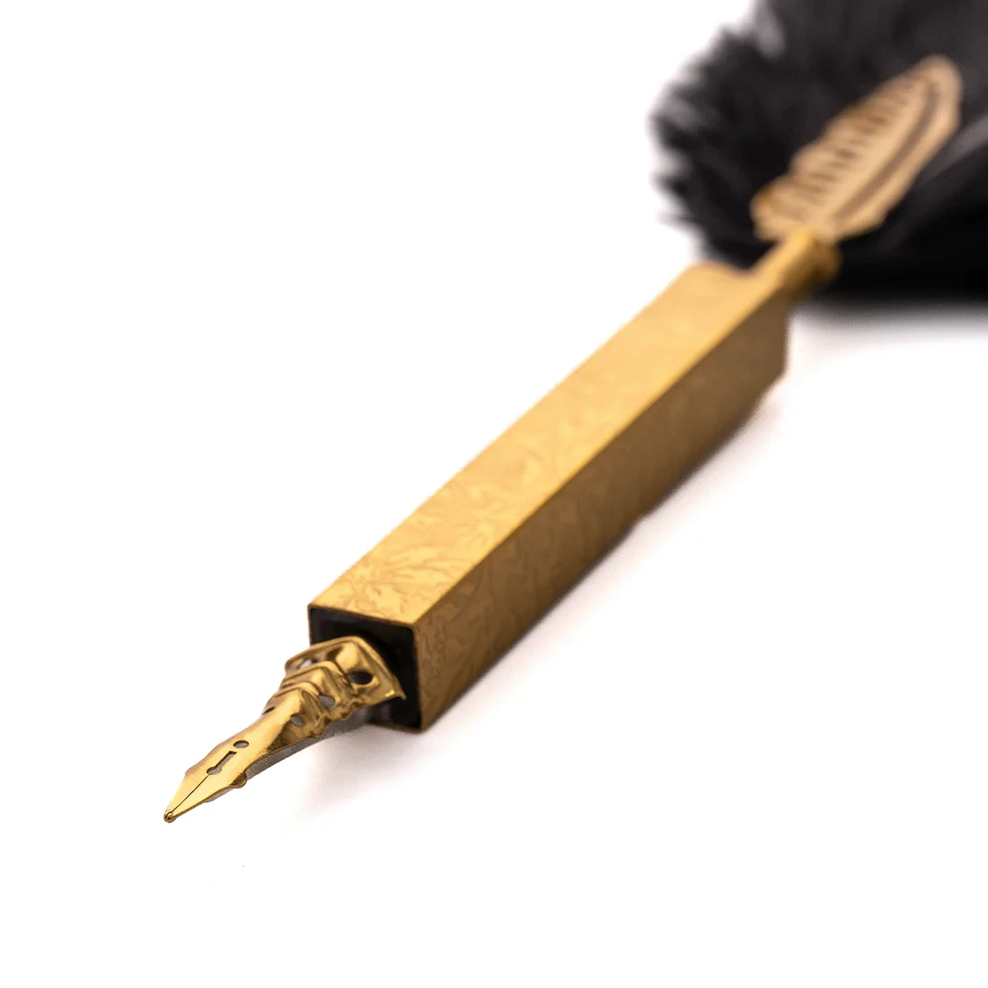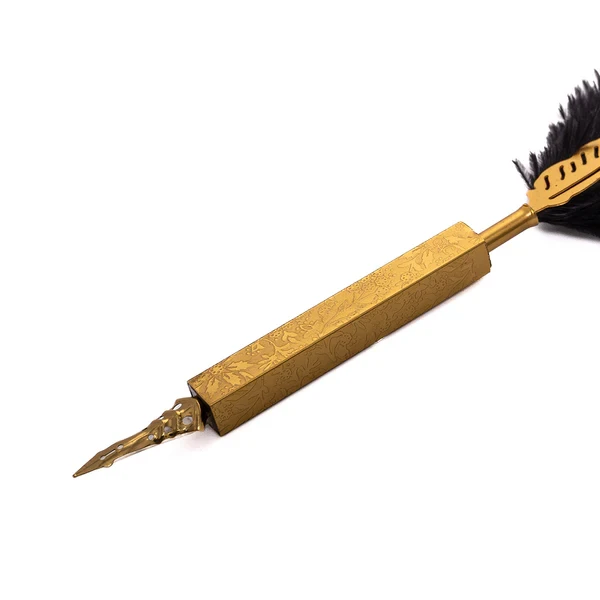 A testament of refinement, here is a pen that oozes class. Intricate floral engraved on the round brass barrel plated in 24K gold. A brass coat of arms brooch also plated in 24K gold forms the upper portion of the pen barrel. The ornate white and black striped pheasant feather completes this stunning pen.